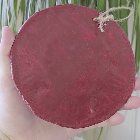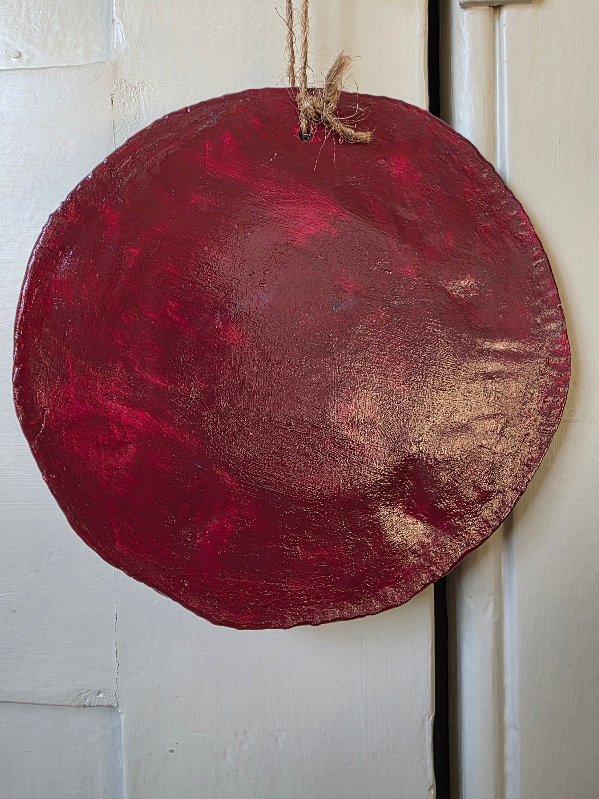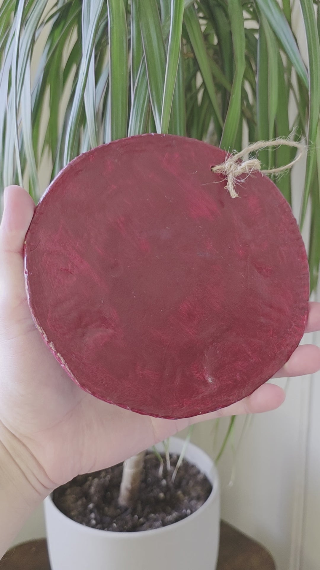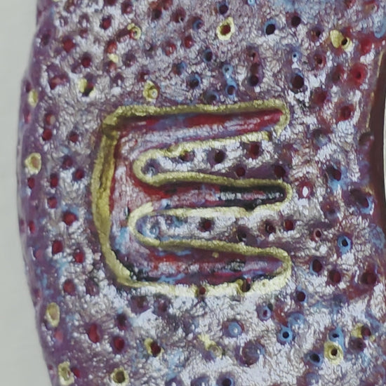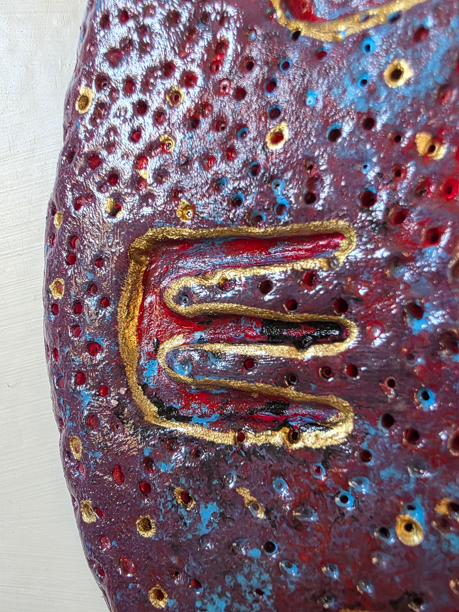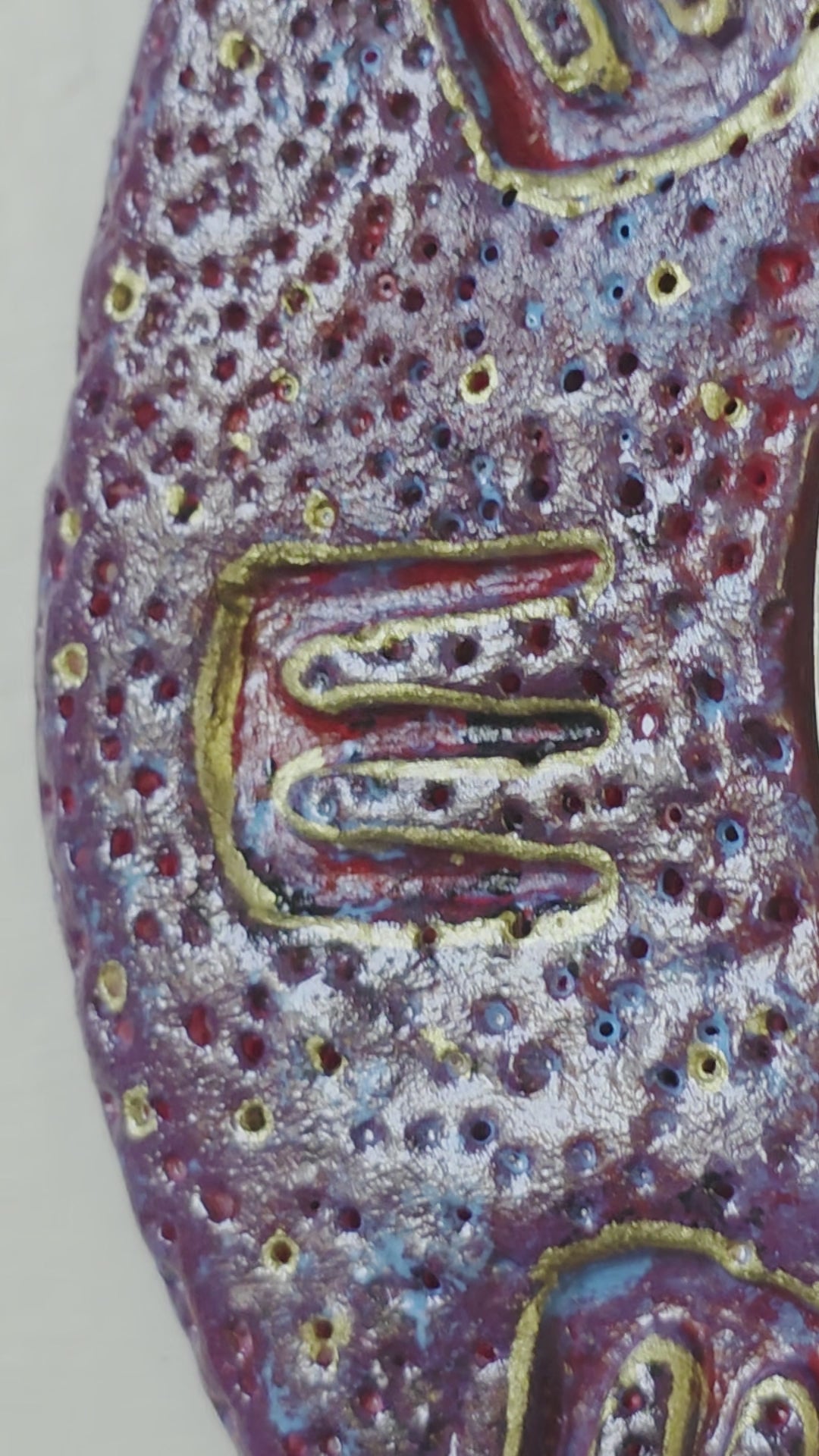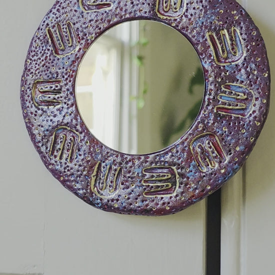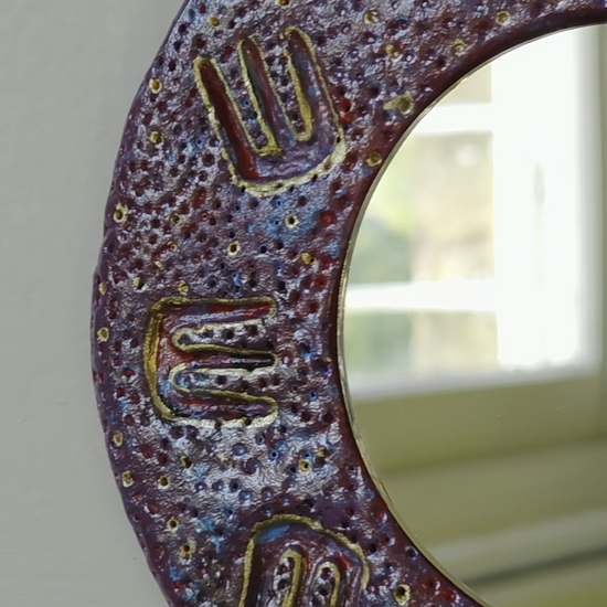 This handcrafted air dry clay mirror features a richly textured frame painted in deep purple with blue speckles and golden highlights. Ten raised gold symbols encircle the design, adding a sense of rhythm and visual intrigue. Hung with twine, it’s a striking accent for gallery walls, cozy corners, or creative spaces. Each piece is one-of-a-kind—blending Fulfilnes artistry with bold color and symbolic detail.