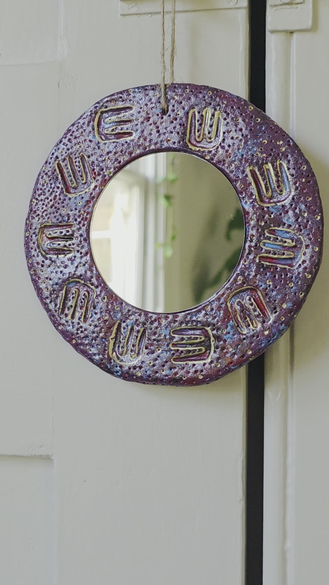 Handmade Air Dry Clay Mirror - Twine Hung, Purple Blue with Gold Symbol Accents
